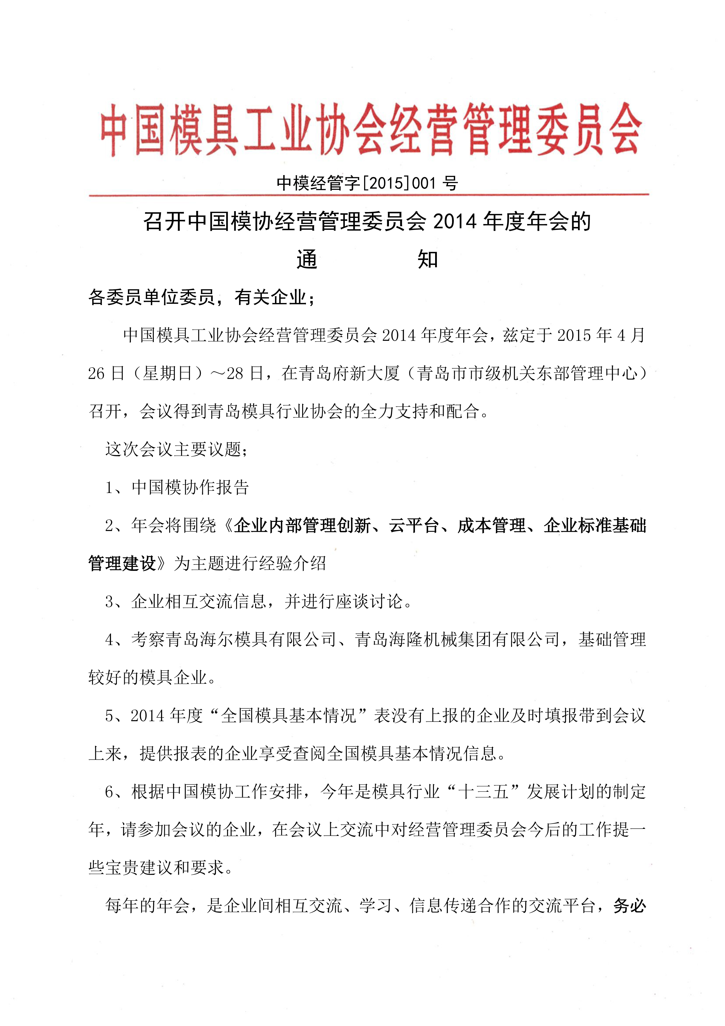 召開(kāi)中國模協(xié)經(jīng)營(yíng)管理委員會(huì )2014年度年會(huì )的通知
