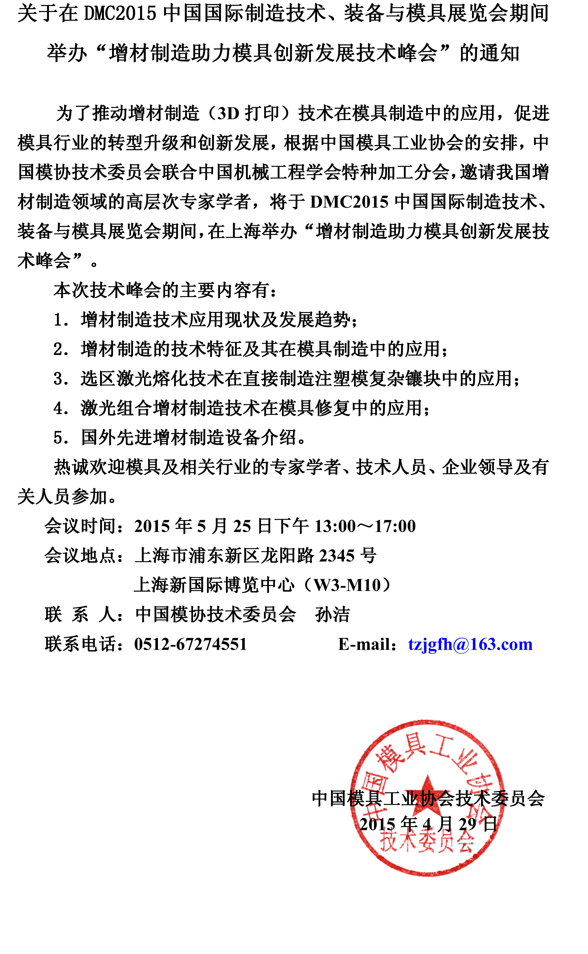 關(guān)于在DMC2015中國國際制造技術(shù)、裝備與模具展覽會(huì )期間舉辦“增材制造助力模具創(chuàng )新發(fā)展技術(shù)峰會(huì )”的通知