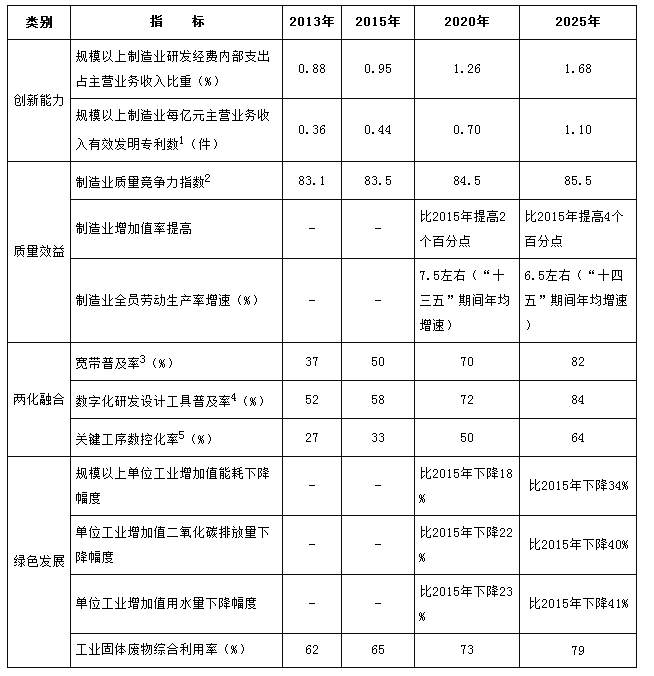 到2025年,制造業(yè)整體素質(zhì)大幅提升,創(chuàng )新能力顯著(zhù)增強,全員勞動(dòng)生產(chǎn)率明顯提高,兩化(工業(yè)化和信息化)融合邁上新臺階。重點(diǎn)行業(yè)單位工業(yè)增加值能耗、物耗及污染物排放達到世界先進(jìn)水平。形成一批具有較強國際競爭力的跨國公司和產(chǎn)業(yè)集群,在全球產(chǎn)業(yè)分工和價(jià)值鏈中的地位明顯提升。