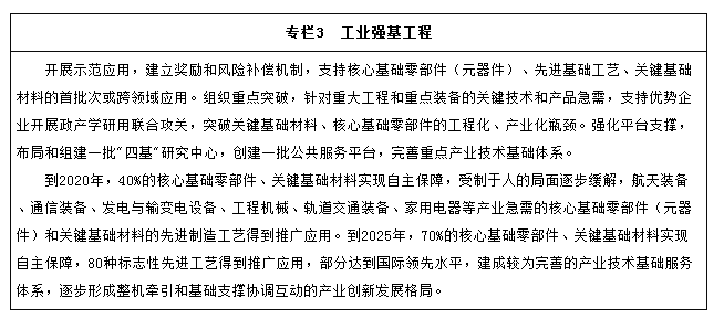核心基礎零部件(元器件)、先進(jìn)基礎工藝、關(guān)鍵基礎材料和產(chǎn)業(yè)技術(shù)基礎(以下統稱(chēng)“四基”)等工業(yè)基礎能力薄弱,是制約我國制造業(yè)創(chuàng )新發(fā)展和質(zhì)量提升的癥結所在。要堅持問(wèn)題導向、產(chǎn)需結合、協(xié)同創(chuàng )新、重點(diǎn)突破的原則,著(zhù)力破解制約重點(diǎn)產(chǎn)業(yè)發(fā)展的瓶頸。