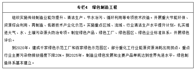 加大先進(jìn)節能環(huán)保技術(shù)、工藝和裝備的研發(fā)力度,加快制造業(yè)綠色改造升級;積極推行低碳化、循環(huán)化和集約化,提高制造業(yè)資源利用效率;強化產(chǎn)品全生命周期綠色管理,努力構建高效、清潔、低碳、循環(huán)的綠色制造體系。
