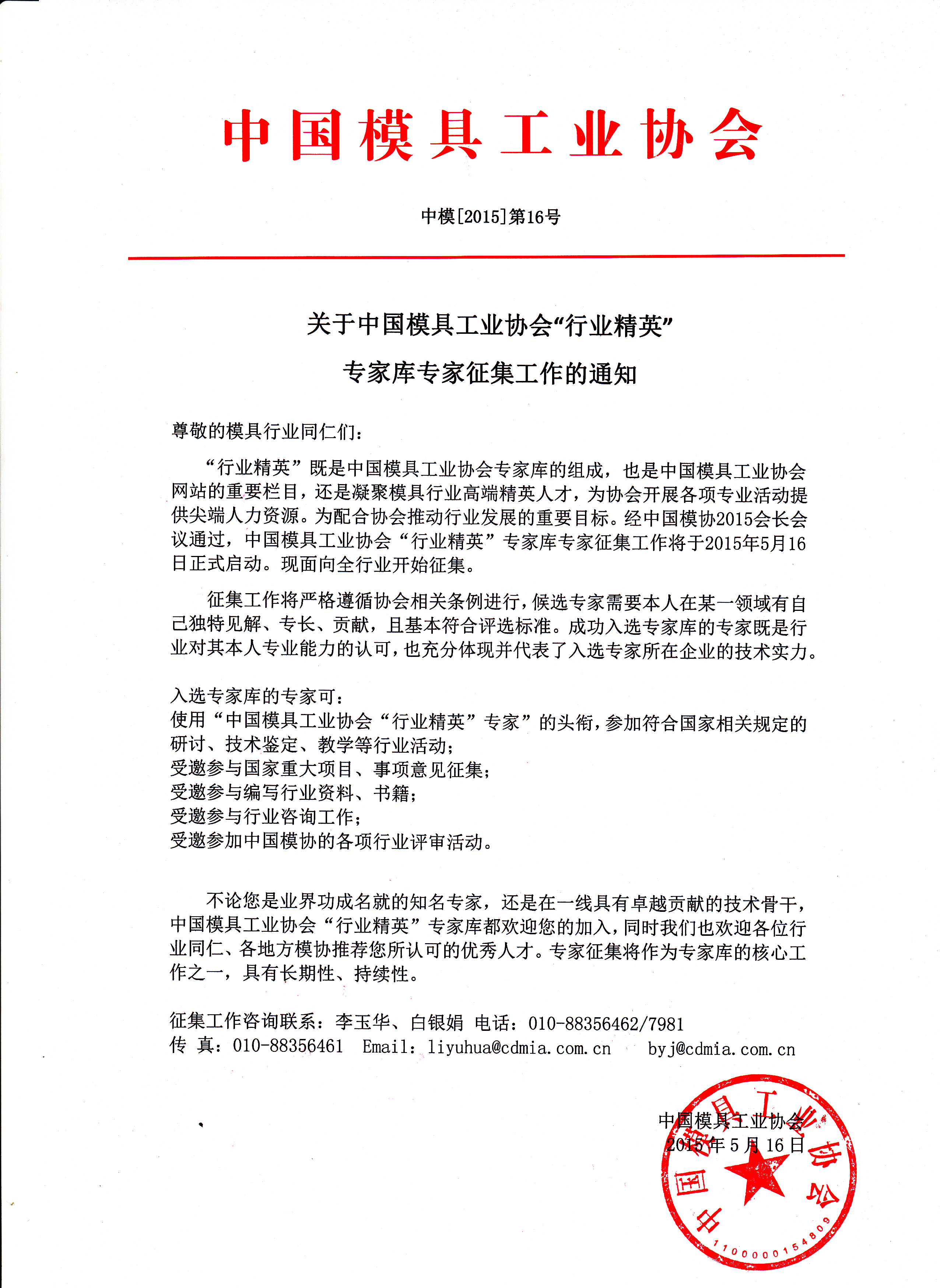 關(guān)于中國模具工業(yè)協(xié)會(huì )“行業(yè)精英”專(zhuān)家庫專(zhuān)家征集工作的通知