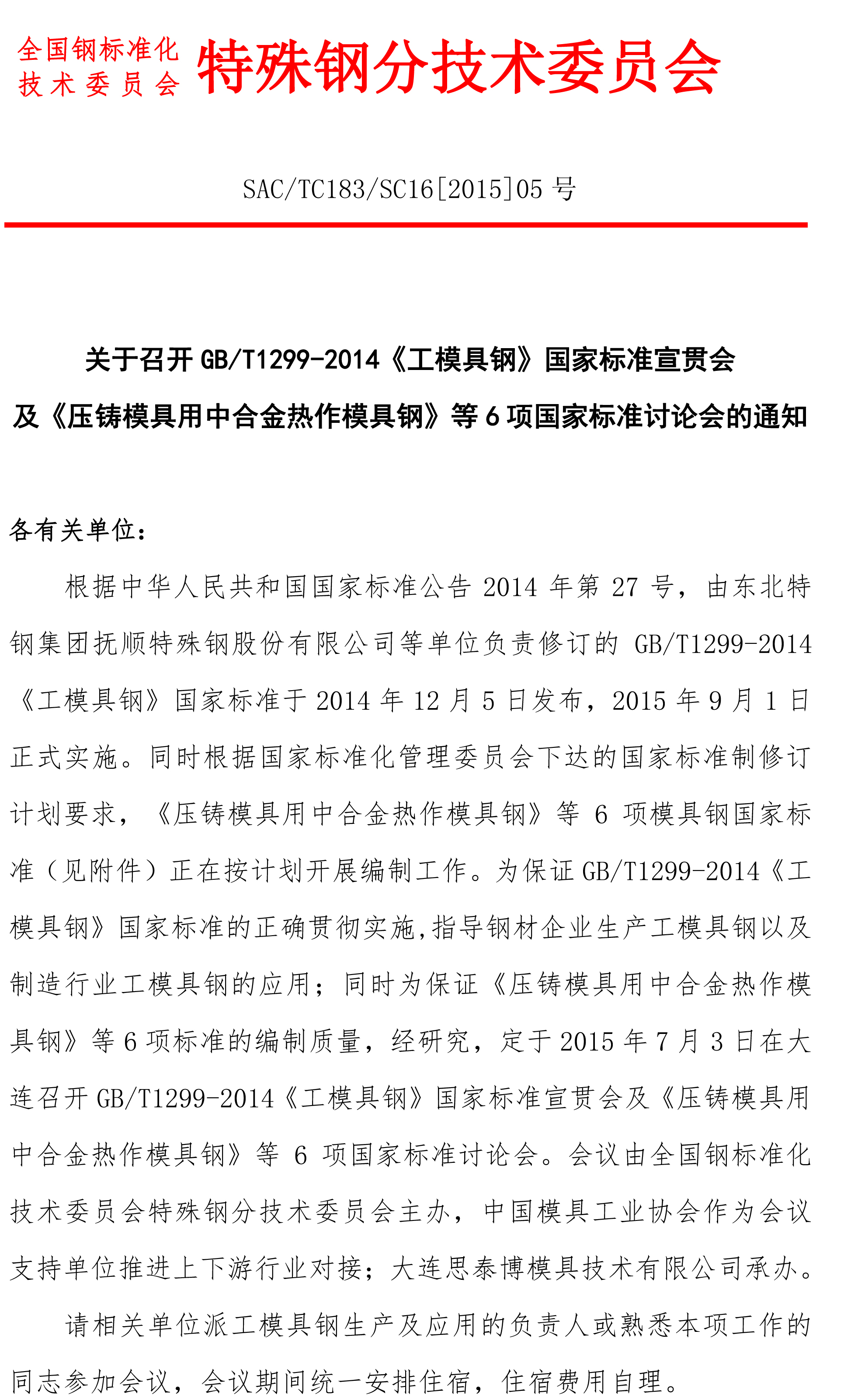 關(guān)于召開(kāi)GB/T1299-2014《工模具鋼》國家標準宣貫會(huì )及《壓鑄模具用中合金熱作模具鋼》等6項國家標準討論會(huì )的通知
