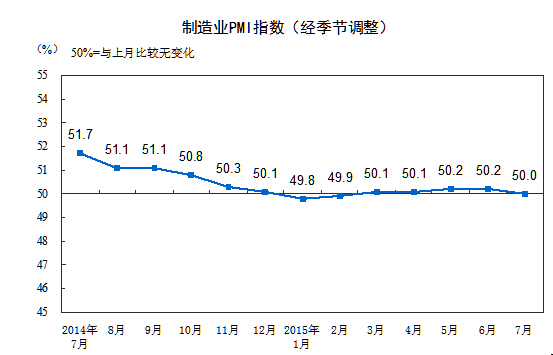 2015年7月份,中國制造業(yè)采購經(jīng)理指數(PMI)為50.0%,比上月回落0.2個(gè)百分點(diǎn),位于臨界點(diǎn)。