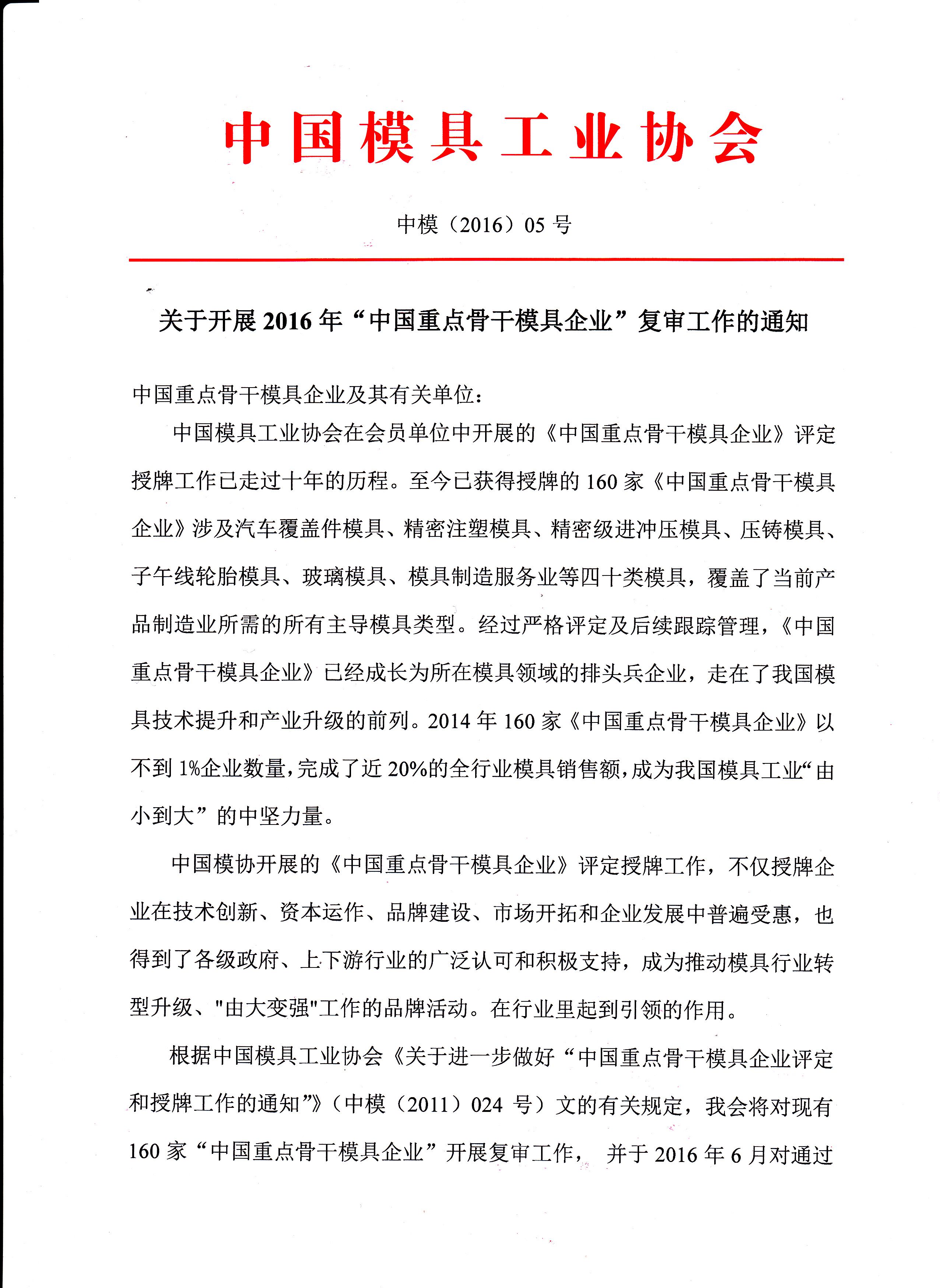 關(guān)于開(kāi)展2016年“中國重點(diǎn)骨干模具企業(yè)”復審工作的通知