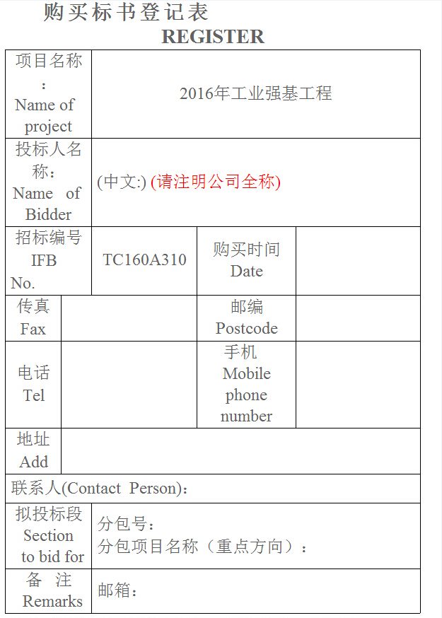 3、招標文件每包600元人民幣,售出不退,沒(méi)有購買(mǎi)招標文件的投標將被視為無(wú)效投標而被否決。如需郵購,請按我公司相關(guān)財務(wù)信息匯款,匯款單上應注明匯款用途、所購招標文件編號/包號,然后將匯款單復印件,購買(mǎi)單位名稱(chēng)、詳細通訊地址、郵編、辦公電話(huà)、手機、傳真及聯(lián)系人等內容傳真給我公司(詳見(jiàn)購買(mǎi)標書(shū)登記表附后),我公司收到傳真后將盡快以快遞方式將招標文件郵寄給貴單位,如需要可提供所購招標文件電子版。