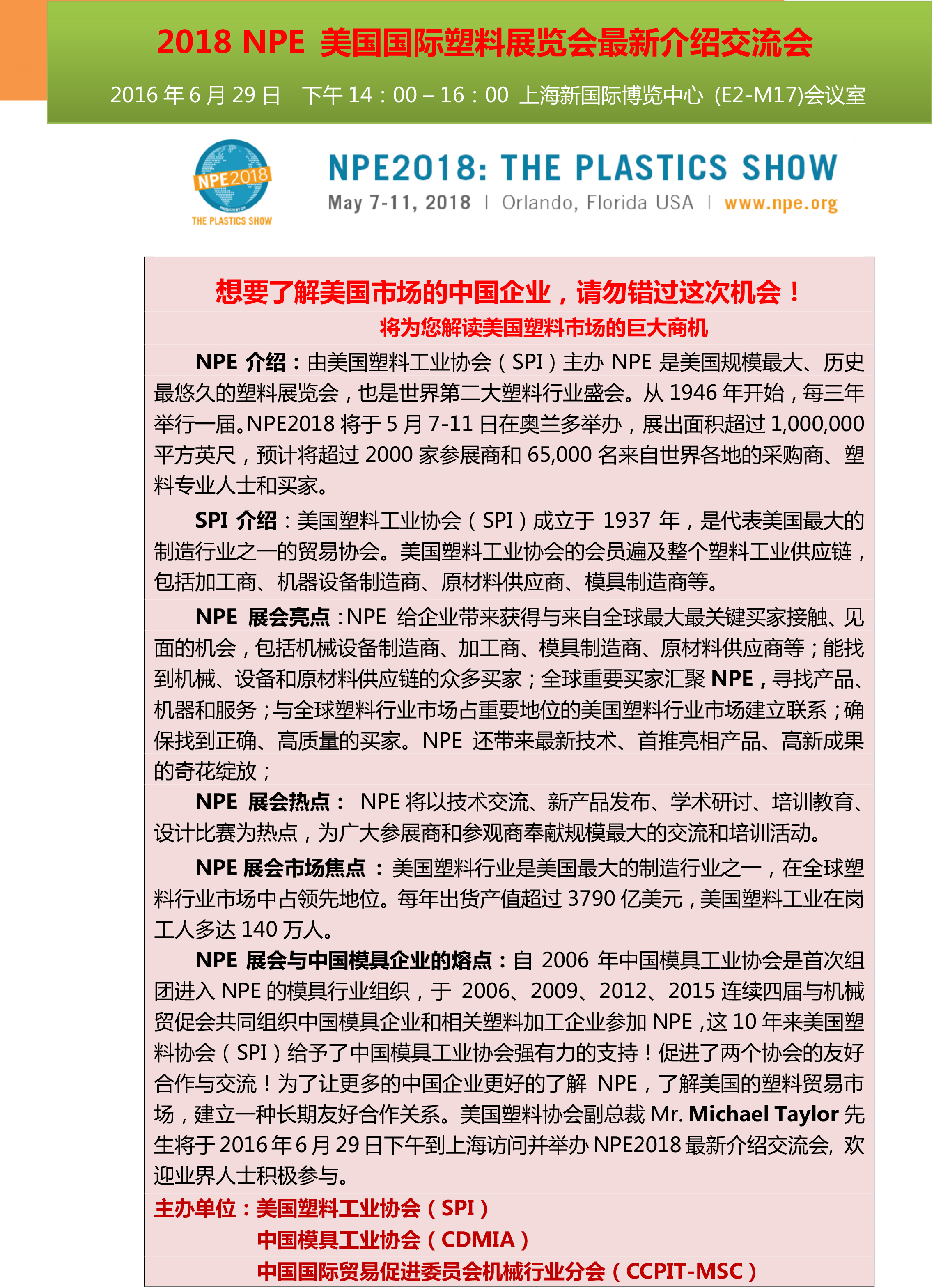 2018NPE 美國國際塑料展覽會(huì )最新介紹交流會(huì )