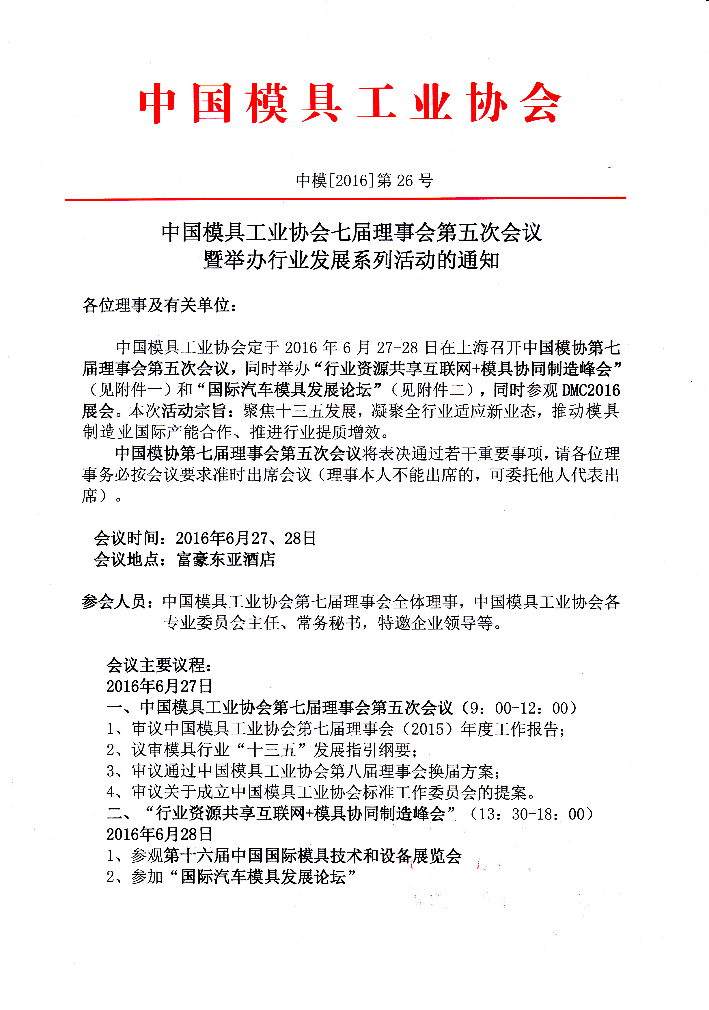 中國模具工業(yè)協(xié)會(huì )七屆理事會(huì )第五次會(huì )議暨舉辦行業(yè)發(fā)展系列活動(dòng)的通知