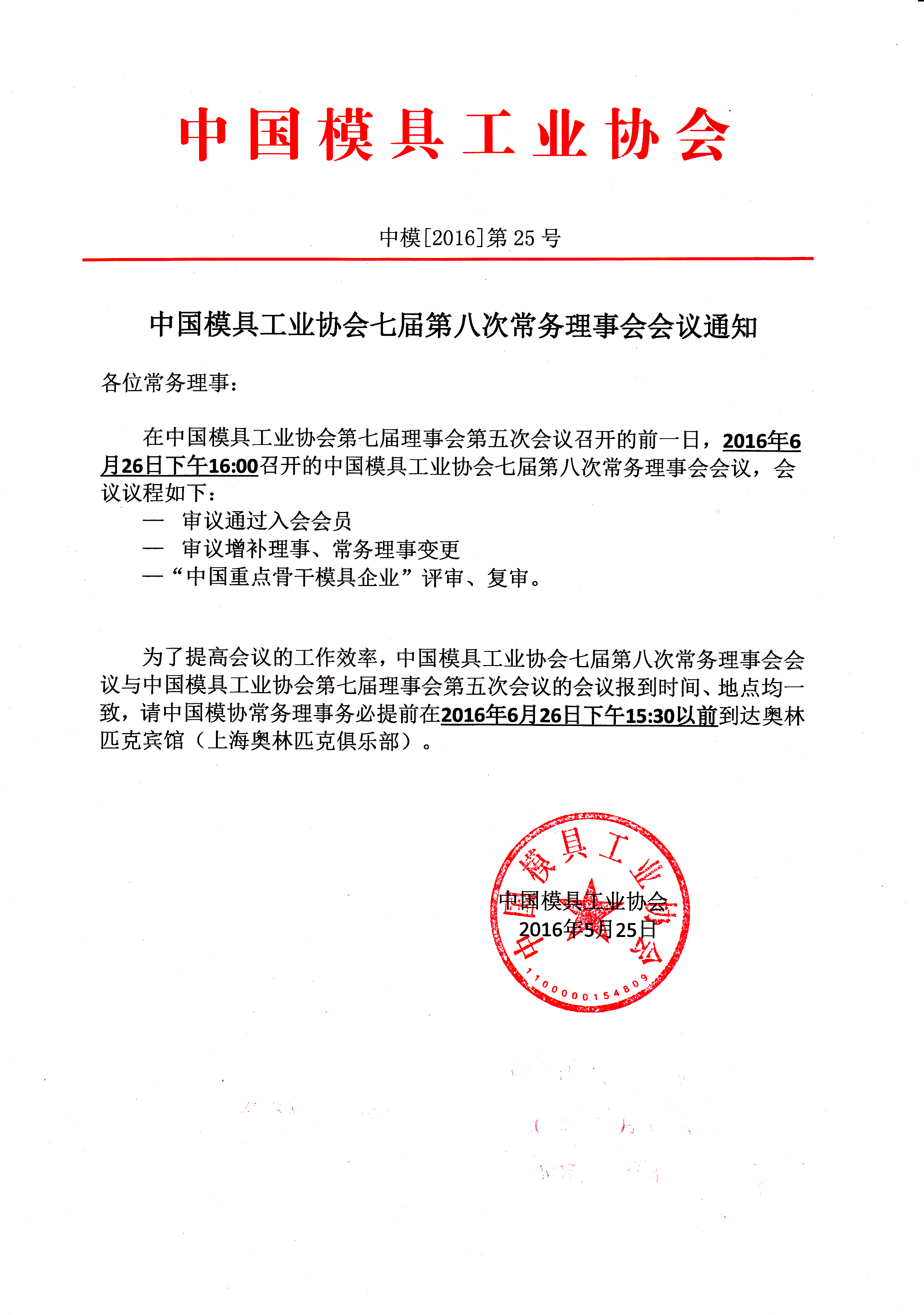 中國模具工業(yè)協(xié)會(huì )七屆第八次常務(wù)理事會(huì )會(huì )議通知