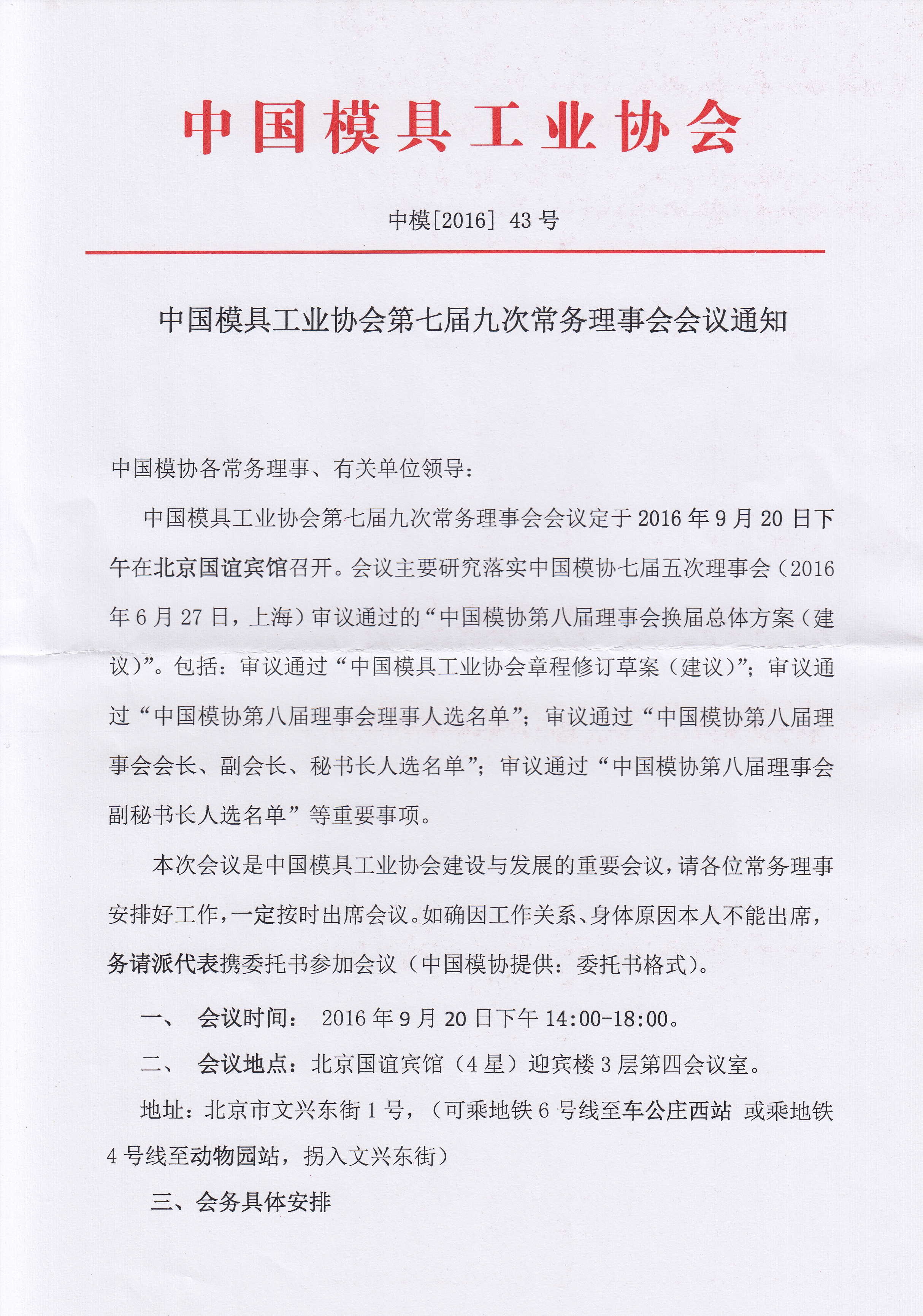 中國模具工業(yè)協(xié)會(huì )第七屆九次常務(wù)理事會(huì )會(huì )議通知