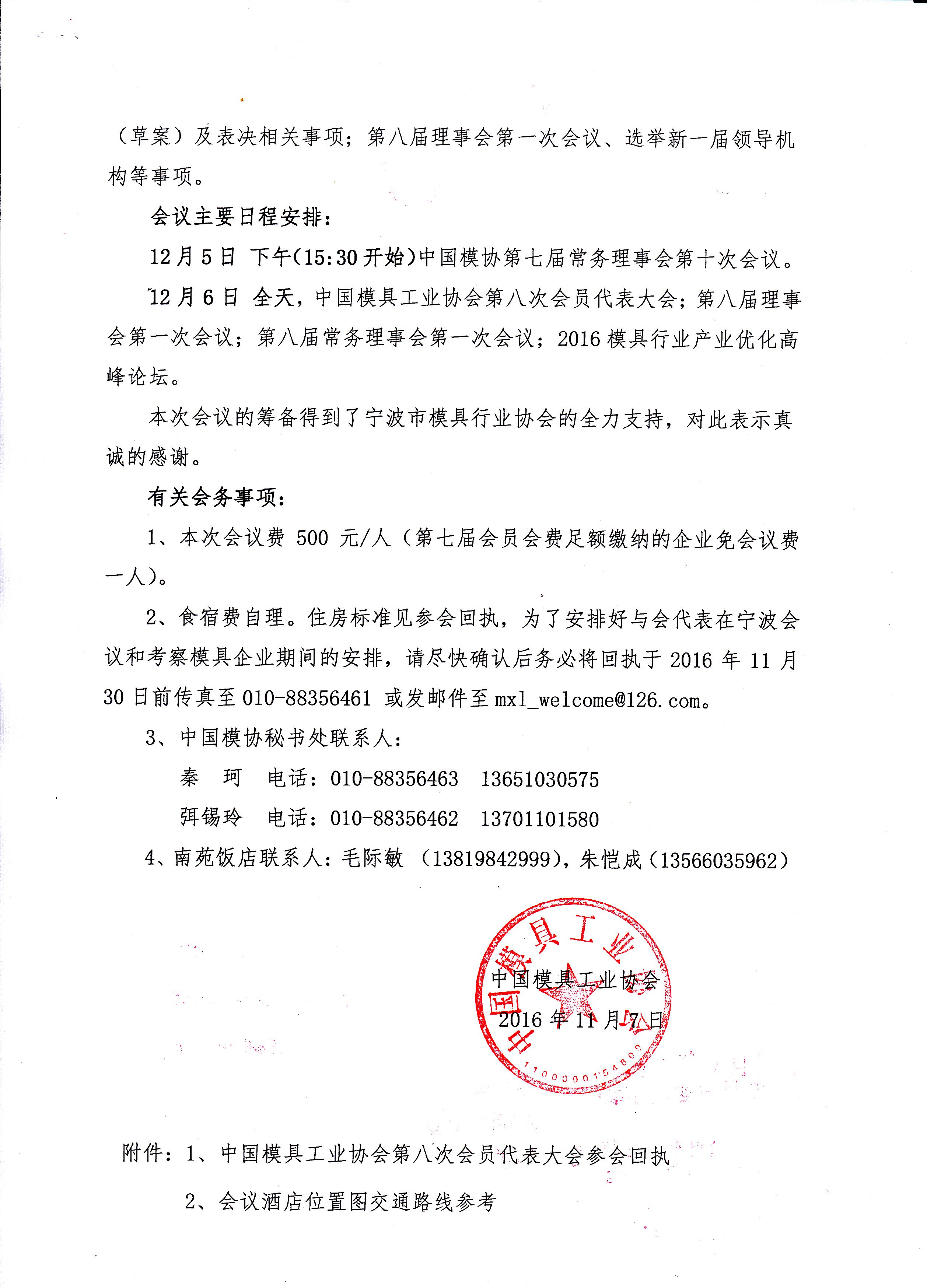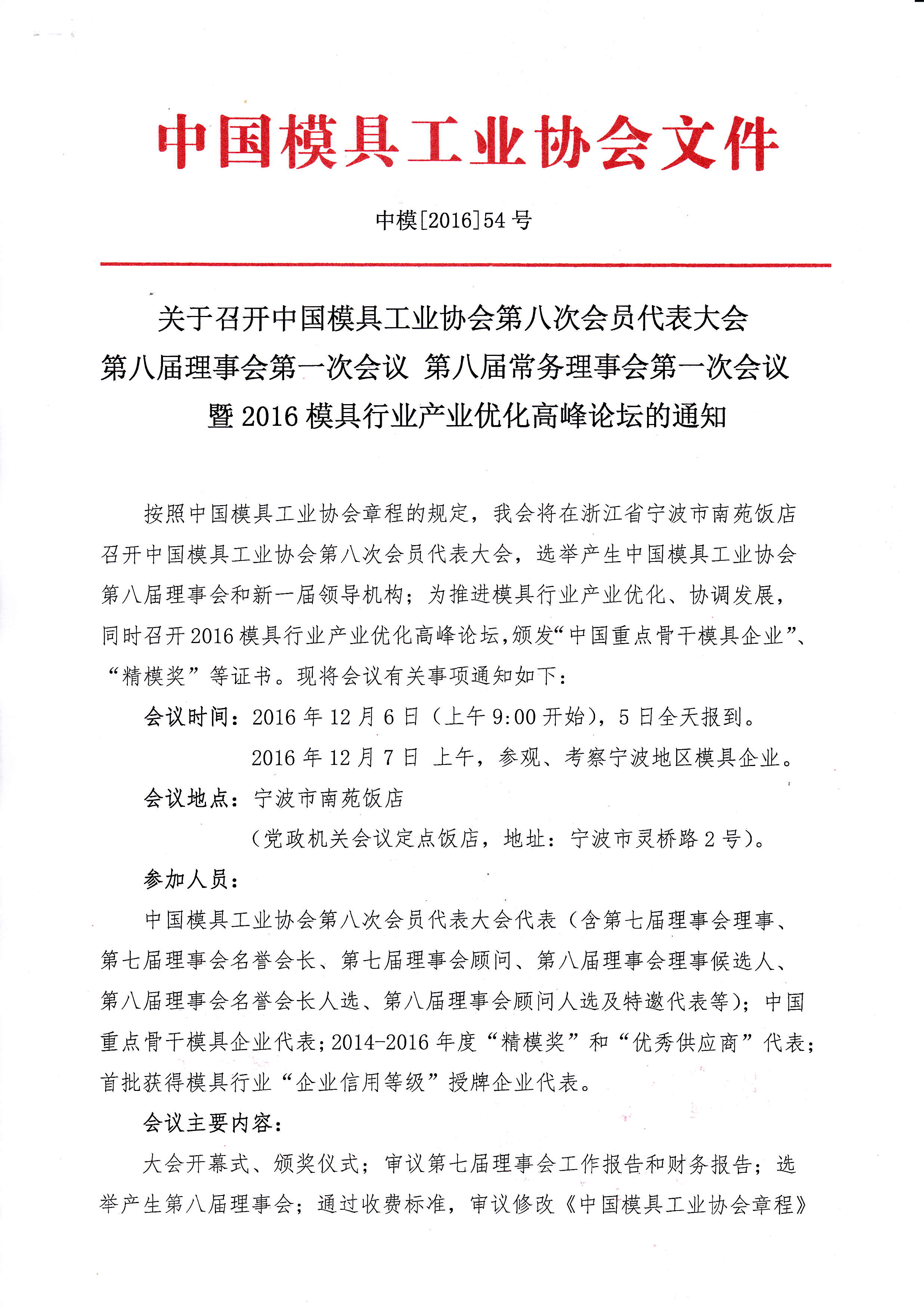 關(guān)于召開(kāi)中國模具工業(yè)協(xié)會(huì )第八次會(huì )員代表大會(huì )第八屆理事會(huì )第一次會(huì )議 第八屆常務(wù)理事會(huì )第一次會(huì )議暨2016模具行業(yè)產(chǎn)業(yè)優(yōu)化高峰論壇的通知