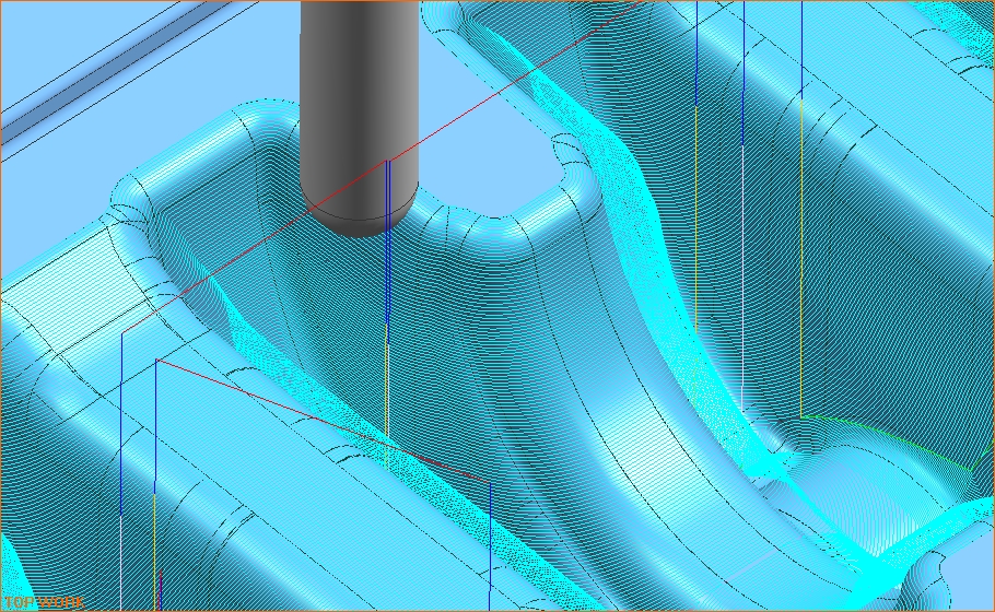 為提高加工效率及保證刀具強度,粗加工時(shí)選擇的刀具直徑較大,導致精加工時(shí)加工余量不均勻,為了保證加工后產(chǎn)品的表面質(zhì)量,精加工時(shí)采用的程序應充分考慮刀片的磨損及刀片自身的耐沖擊性,盡量保證清根時(shí)余量均勻。進(jìn)行了數控精加工程序參數設計及數控精加工程序刀路設計。示意圖見(jiàn)圖片(四)。