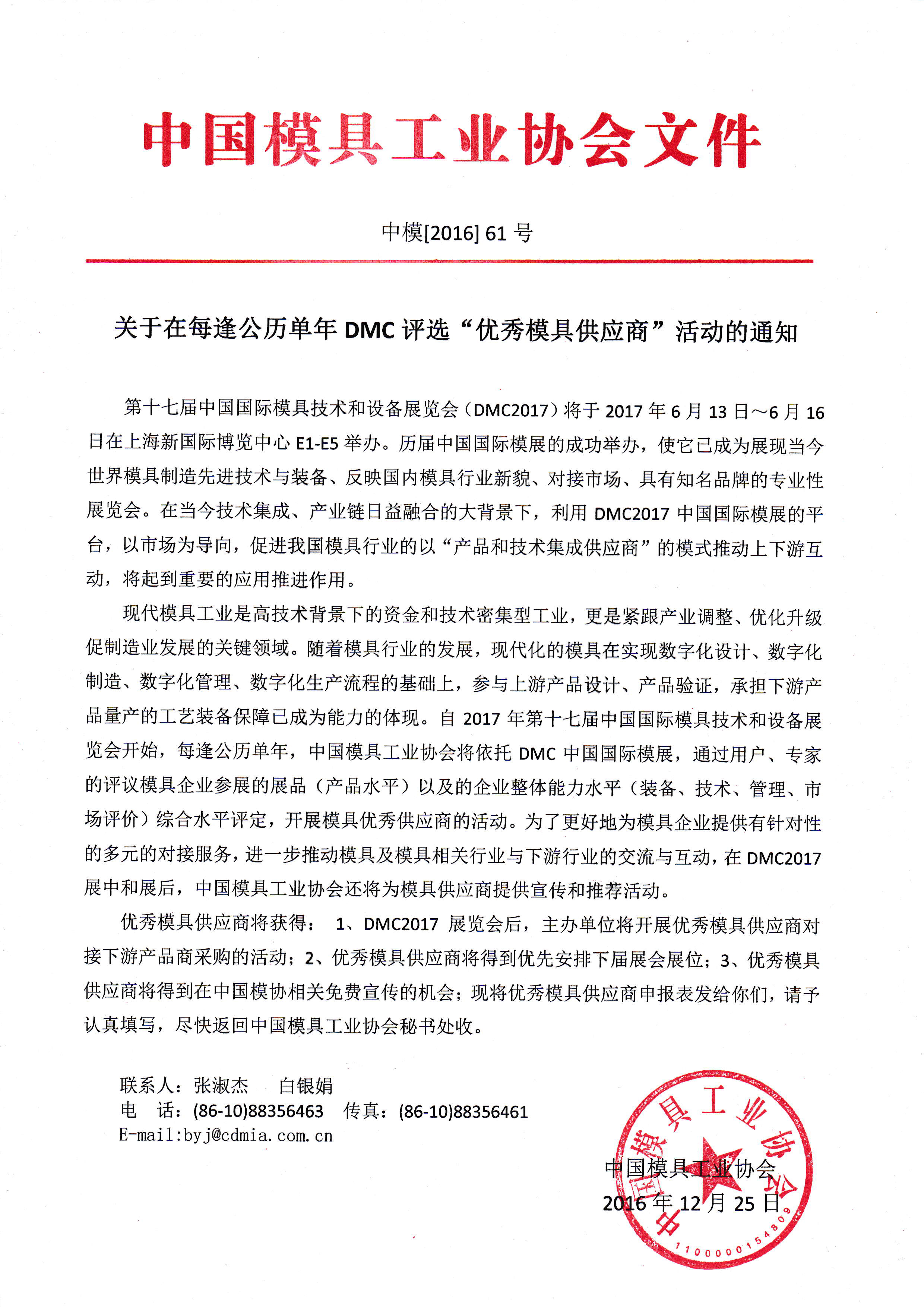 關(guān)于在每逢公歷單年DMC評選“優(yōu)秀模具供應商”活動(dòng)的通知