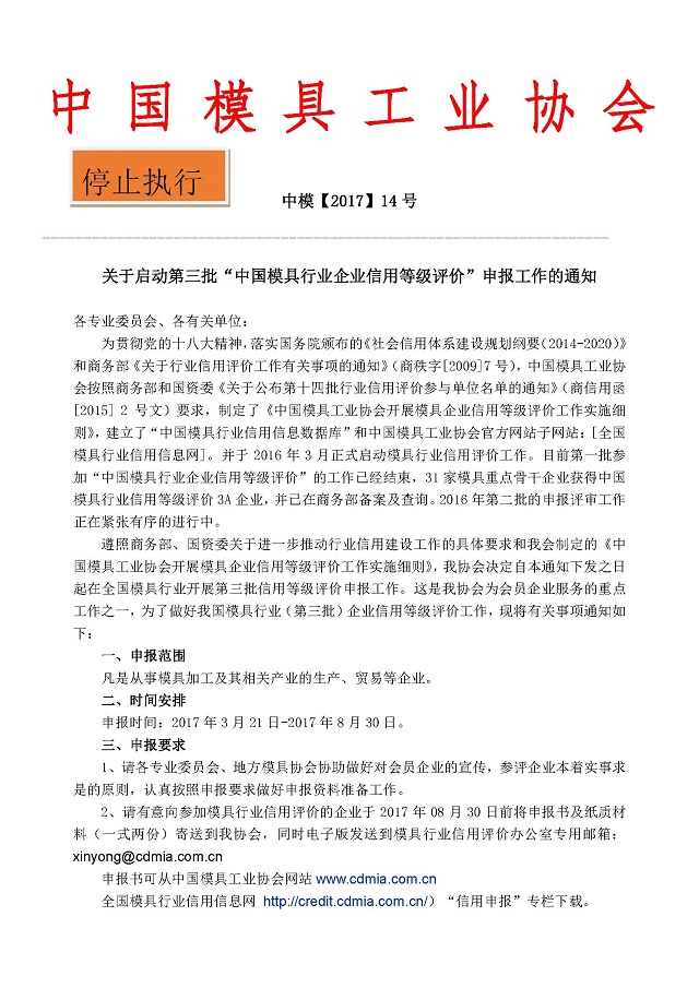 關(guān)于啟動(dòng)第三批“中國模具行業(yè)企業(yè)信用等級評價(jià)”申報工作的通知