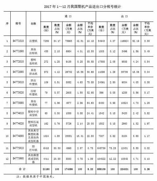 2017年中國塑機產(chǎn)品進(jìn)出口分稅號統計數據。