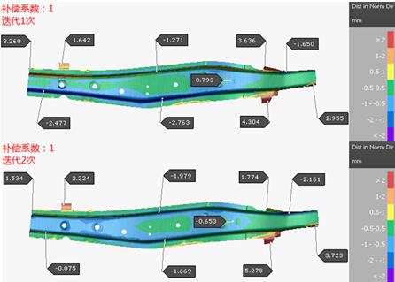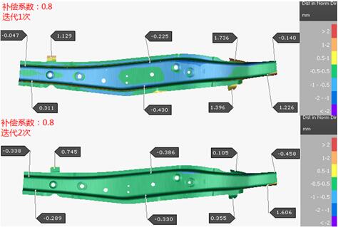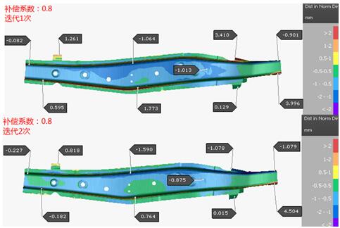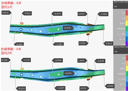 再次嘗試進(jìn)行補償系數為0.8的補償,其補償后的回彈結果如圖10所示,由回彈補償的結果可知,兩次迭代的補償效果均比補償系數為1的效果好,但是零件的法蘭區域的回彈還是較大,還需要改善。再?lài)L試用補償系數為0.9、1.1和1.2來(lái)進(jìn)行補償,補償效果均不如補償系數為0.8的,所以最終確定選用0.8作為最佳的補償系數來(lái)進(jìn)行其它方案的補償。