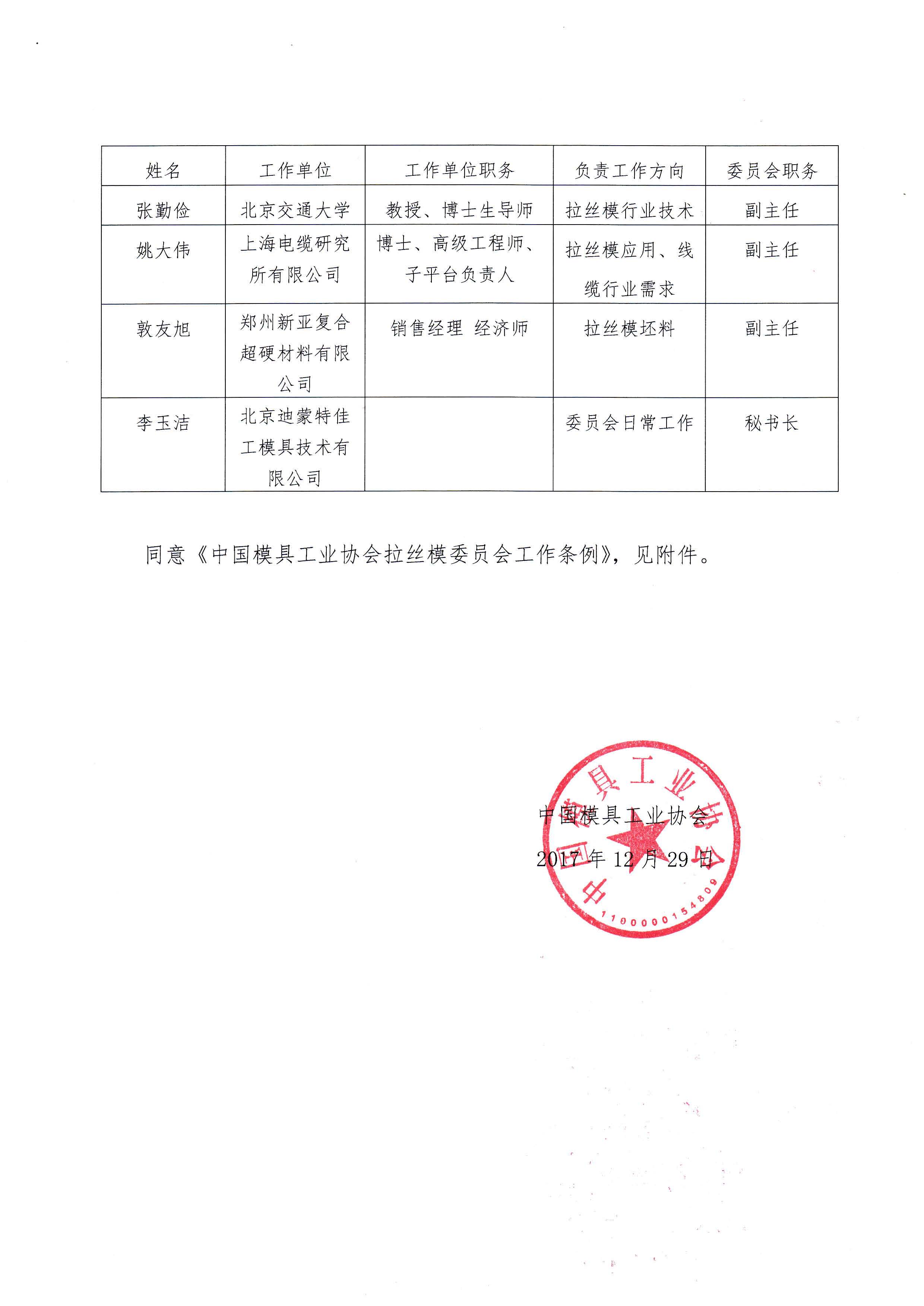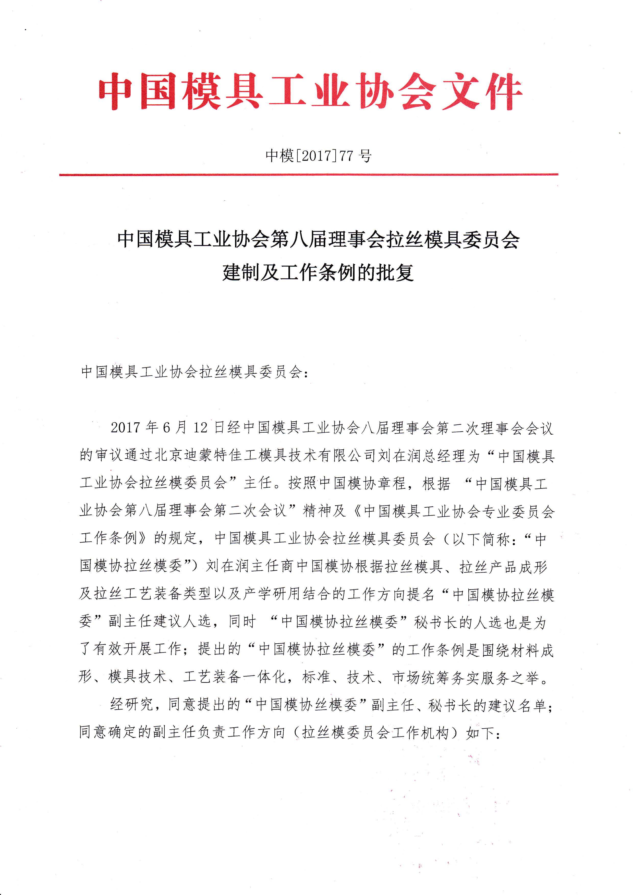 中國模具工業(yè)協(xié)會(huì )第八屆理事會(huì )拉絲模具委員會(huì )建制及工作條例的批復