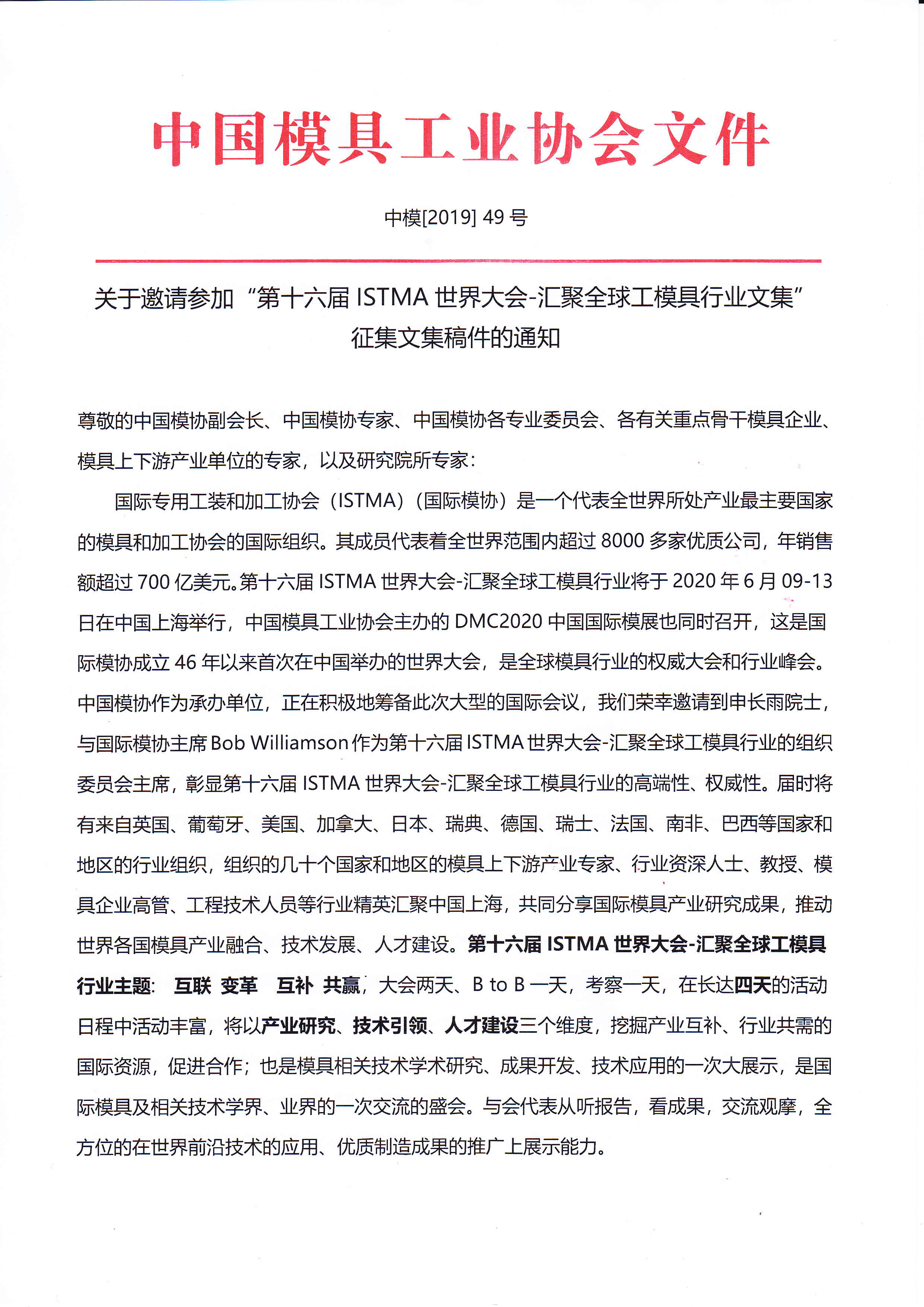 關(guān)于邀請參加“第十六屆ISTMA世界大會(huì )——匯聚全球工模具行業(yè)文集”征集文集稿件的通知
