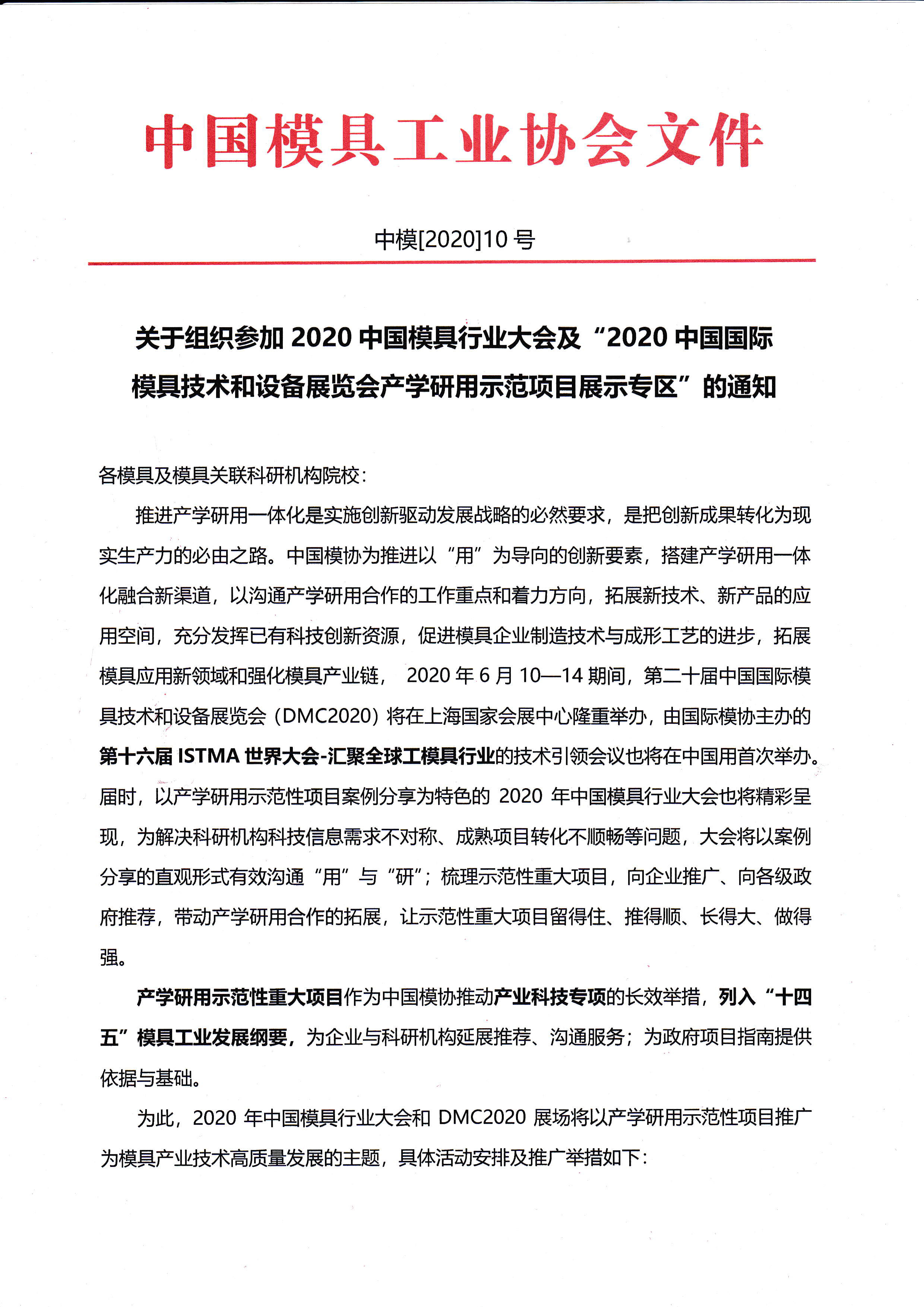 關(guān)于組織參加2020中國模具行業(yè)大會(huì )及“2020中國國際模具技術(shù)和設備展覽會(huì )產(chǎn)學(xué)研用示范項目展示專(zhuān)區”的通知