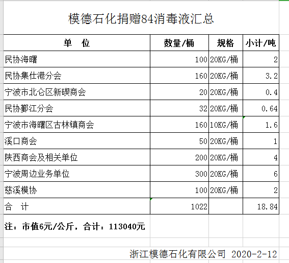 隨著(zhù)新冠肺炎疫情的發(fā)展以及防控需求的不斷增大,消毒用品成為當下最緊缺的物資之一。中國模協(xié)理事、中國模協(xié)裝備委員會(huì )副主任,寧波市陜西商會(huì )副會(huì )長(cháng)、浙江模德石化有限公司總經(jīng)理趙小軍意識到此次疫情對社會(huì )的影響與自身的擔當,在當前防疫需求緊迫和供應困難的情況下, 2月8日迅速做出一個(gè)重要的決定,通過(guò)有效平臺向大型超市、快遞公司、倉儲物流、酒店賓館、餐飲企業(yè)、中小制造企業(yè)及公益單位無(wú)償捐贈84消毒液,在寧波海曙區民營(yíng)企業(yè)協(xié)會(huì )等機構的穿針引線(xiàn)下為轄區企業(yè)防疫提供盡可能的消毒產(chǎn)品供給,盡快安全復工提供幫助。