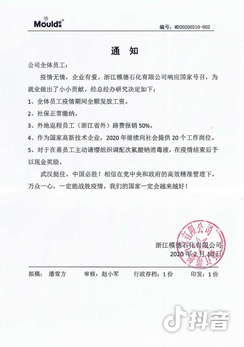 模德石化有限公司致全體職工的通知感染了我們,疫情無(wú)情,我們有愛(ài)!5條舉措實(shí)實(shí)在在為我們呈現了一個(gè)企業(yè)家的擔當與責任!這樣的企業(yè)一定是一個(gè)可以信賴(lài)的長(cháng)久合作企業(yè)!一定是一個(gè)支撐模具企業(yè)發(fā)展的緊密伙伴企業(yè)!