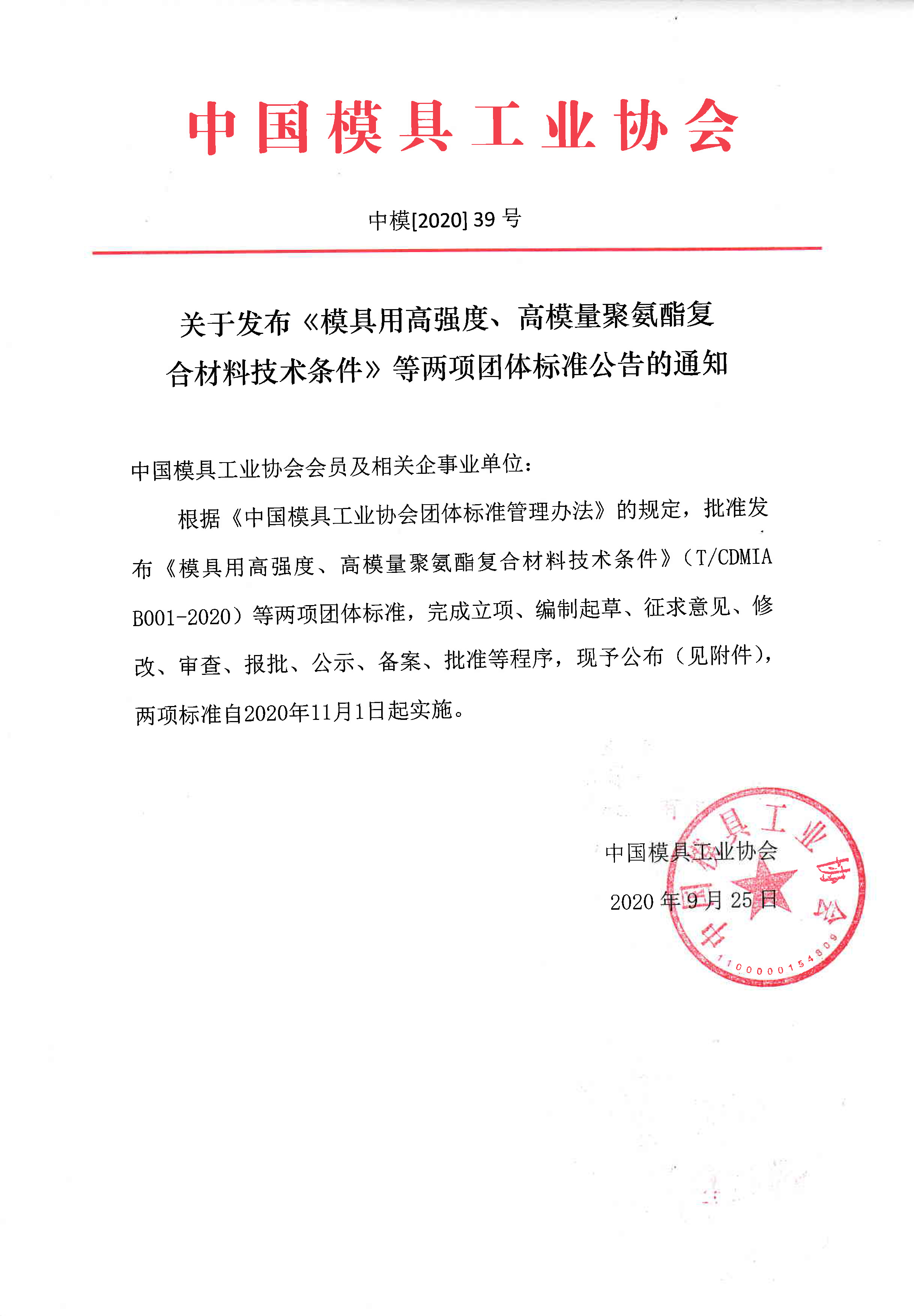 關(guān)于發(fā)布《模具用高強度、高模量聚氨酯復合材料技術(shù)條件》等兩項團體標準公告的通知