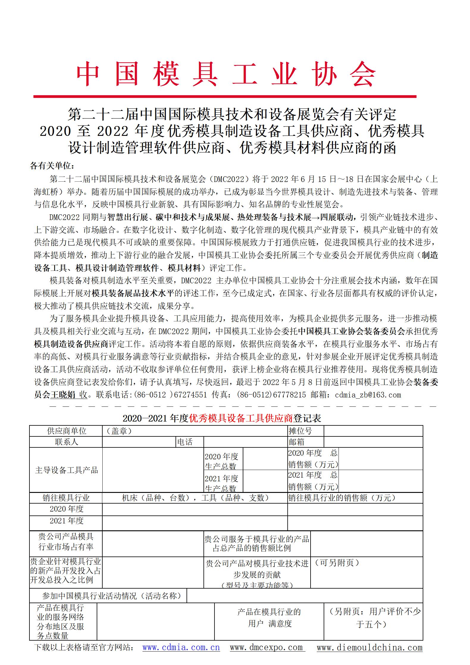 第二十二屆中國國際模具技術(shù)和設備展覽會(huì )有關(guān)評定 2020至2022年度優(yōu)秀模具制造設備工具供應商、優(yōu)秀模具設計制造管理軟件供應商、優(yōu)秀模具材料供應商的函