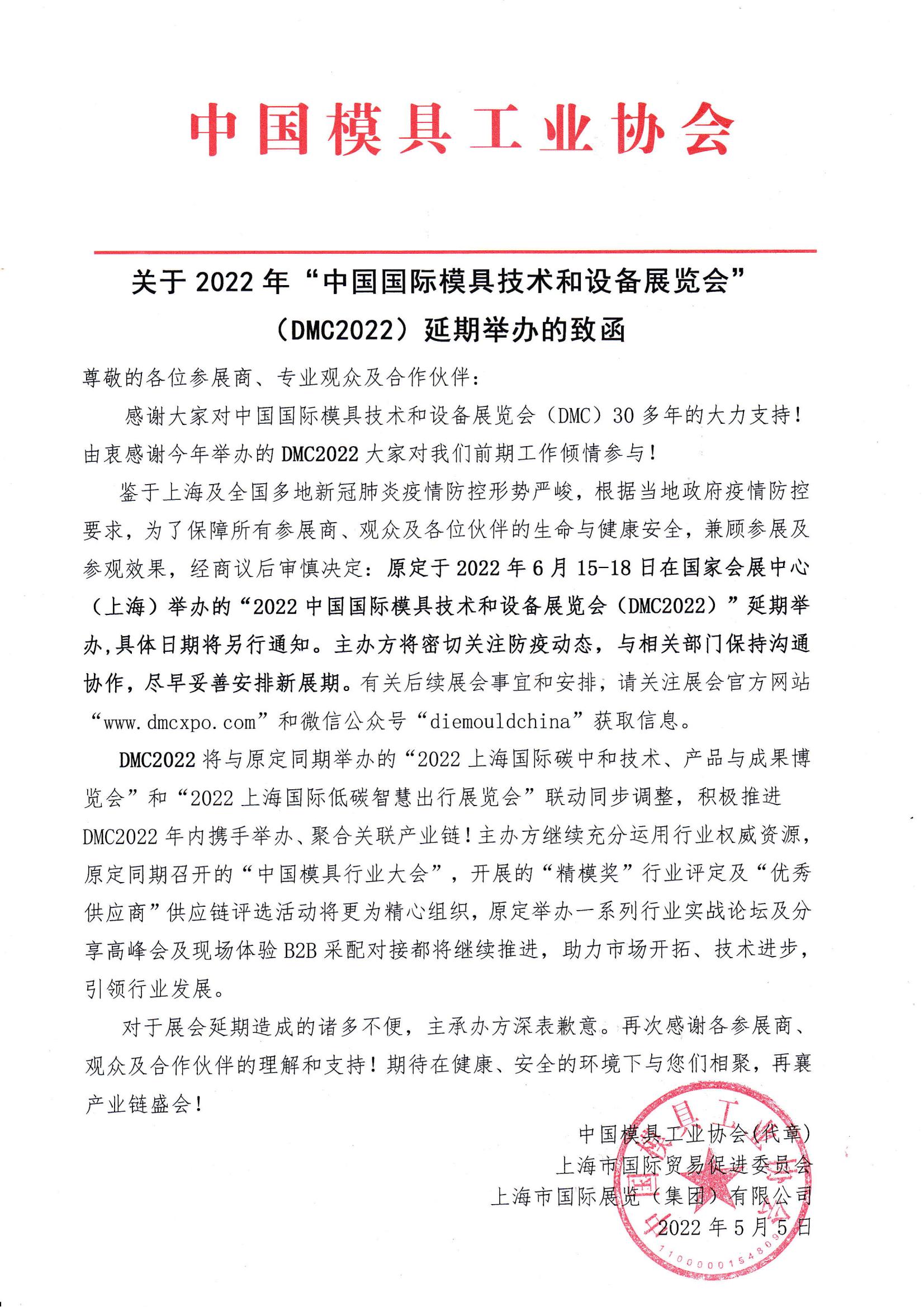 關(guān)于2022年“中國國際模具技術(shù)和設備展覽會(huì )”(DMC2022)延期舉辦的致函