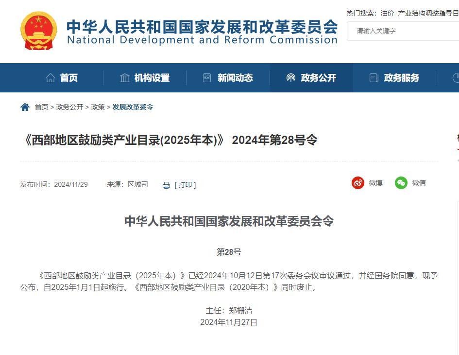 《西部地區鼓勵類(lèi)產(chǎn)業(yè)目錄(2025年本)》 2024年第28號令