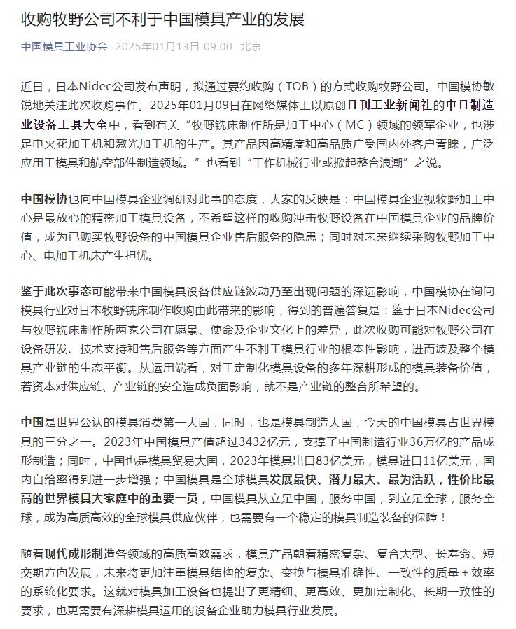 收購牧野公司不利于中國模具產(chǎn)業(yè)的發(fā)展