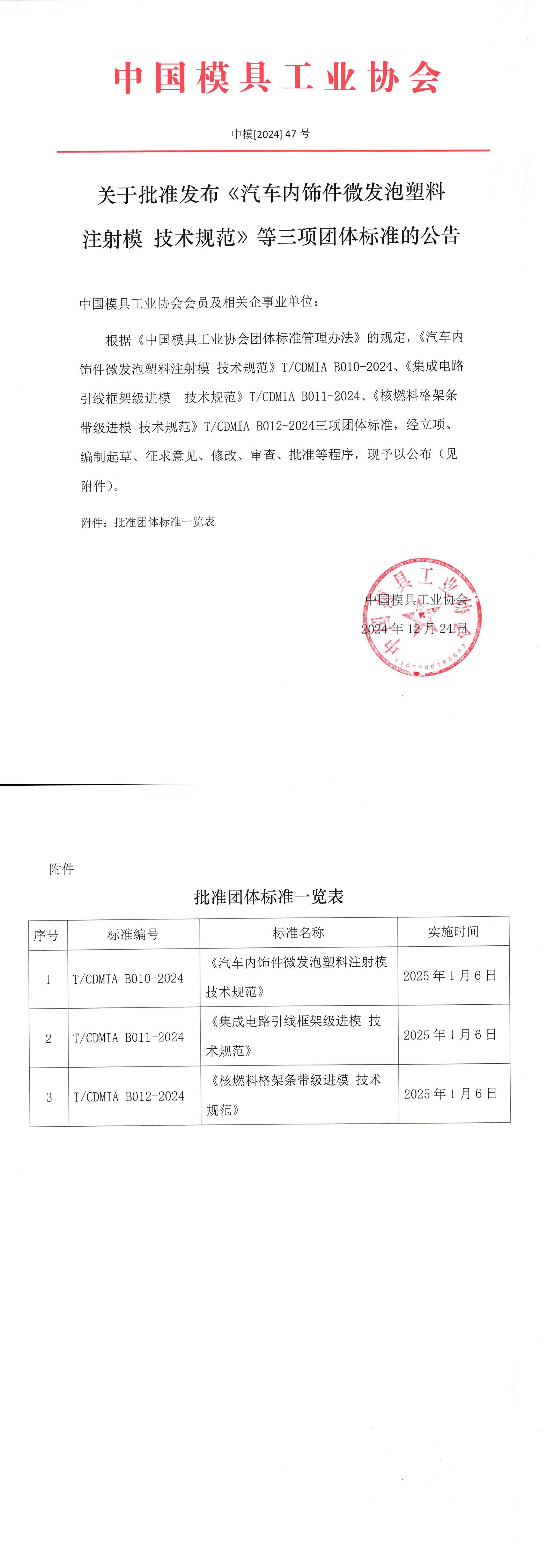 關(guān)于批準發(fā)布《汽車(chē)內飾件微發(fā)泡塑料注射模 技術(shù)規范》等三項團體標準的公告